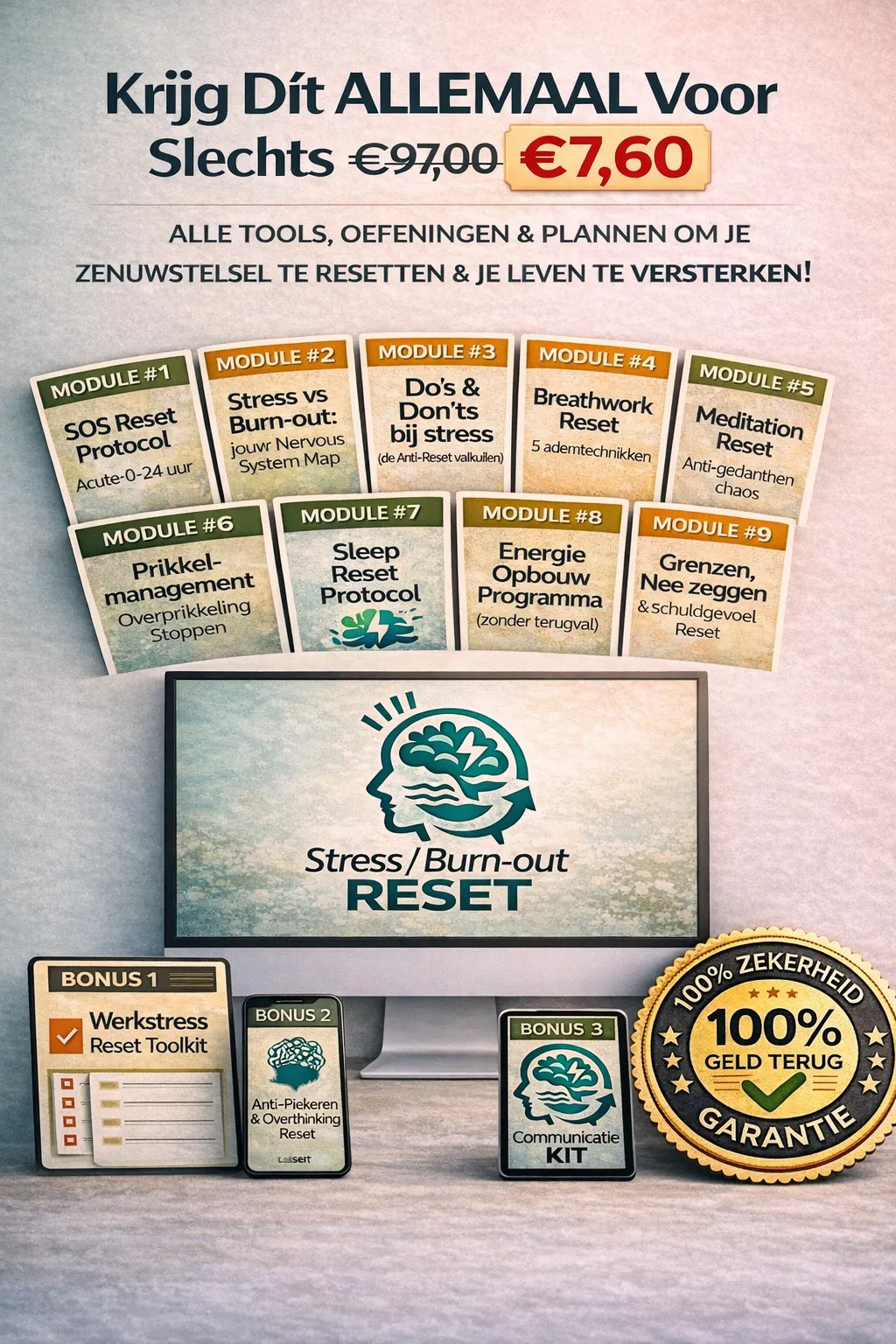 Als onderdeel van onze pre-launch campagne (om reviews te verzamelen), bieden we de Stress/Burn-out Reset Bundel tijdelijk aan voor slechts €7,60 (normaal €97,00).
